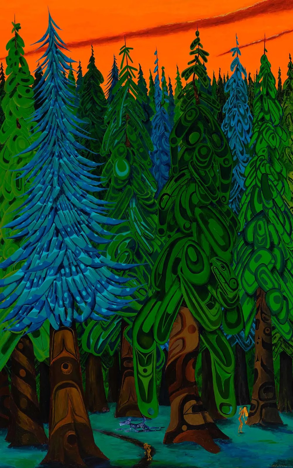 The next piece, Natives Playing on the Land by Lets’lo:seltun/Lawrence Paul Yuxweluptun (2015, oil on canvas) is composed of bright oranges and dark greens. The humans depicted in the painting are very small compared to the overwhelming nature surrounding them; reminiscent of the idea of our perpetual destruction of the environment colonized from Indigenous land. The piece that accompanies this painting is a sculpture titled Nunatta Sapujjijingit/Protectors of our Land (2021, Bowhead whale bone, caribou antler, muskox horn, walrus tusk ivory, marble, stone, mother-of-pearl) by Manasie Akpaliapik, that draws on Inuit stories, myths, and the connection between nature, animals, and humans. Both pieces provide important insight on Indigenous stories while commenting on environmental issues through different forms of media.